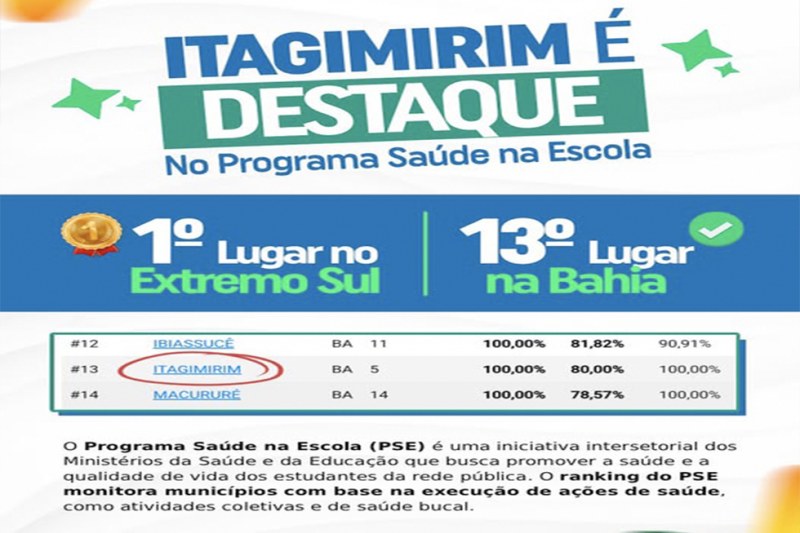 Gestão do prefeito Luizinho conquista mais um importante feito, o 1ª Lugar entre os município da Costa do Descobrimento e o 13º lugar entre os 417 municípios baisno no ranking do PSE - Programa Saúde na Escola. A premiação foi realizada em parceria entre as áreas de Saúde e Educação do estado da Bahia.