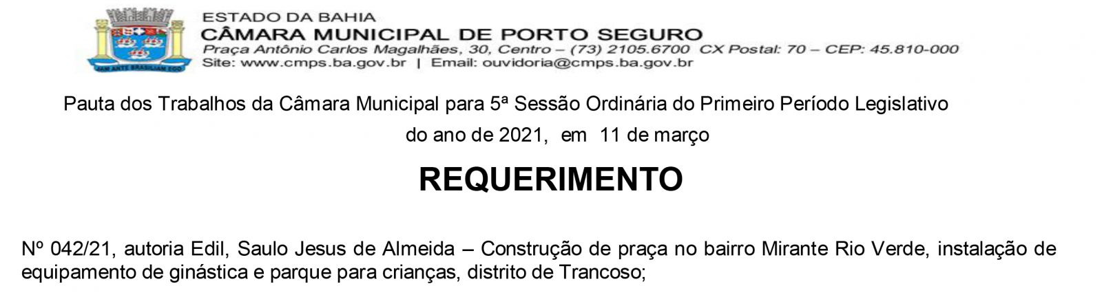 Na Sessão Ordinária da Câmara Municipal de Porto Seguro na última quinta-feira 11/03, o Vereador Saulo da Distribuidora, no uso de suas tribuições legais, encaminhou REQUERIMENTO solicitando do exucutivo municipal, benefícios para o Bairro Mirante Rio Verde em Trancoso, Orla Sul da cidade, dentre as reivindicações estão;