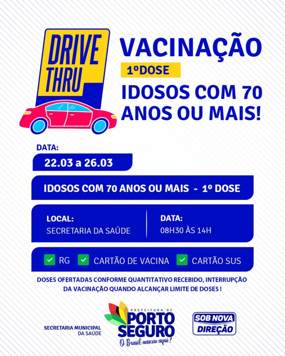 A prefeitura de Porto Seguro, através da Secretaria Municipal de Saúde, inicia nesta segunda-feira 22/03, vacinação para idosos a partir dos 70 anos. A ação acontece na sede, distritos e zona rural.