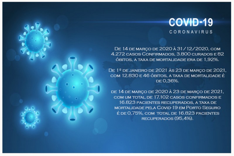 Aos somarmos todo o período da PANDEMIA, de 14 de março de 2020 à 23 de março de 2021, com um total de 17.102 casos confirmados e 16.823 pacientes recuperados, a taxa de mortalidade pela Covid-19 em Porto Seguro é de 0,75%, com total de 16.823 pacientes recuperados (95,4%).