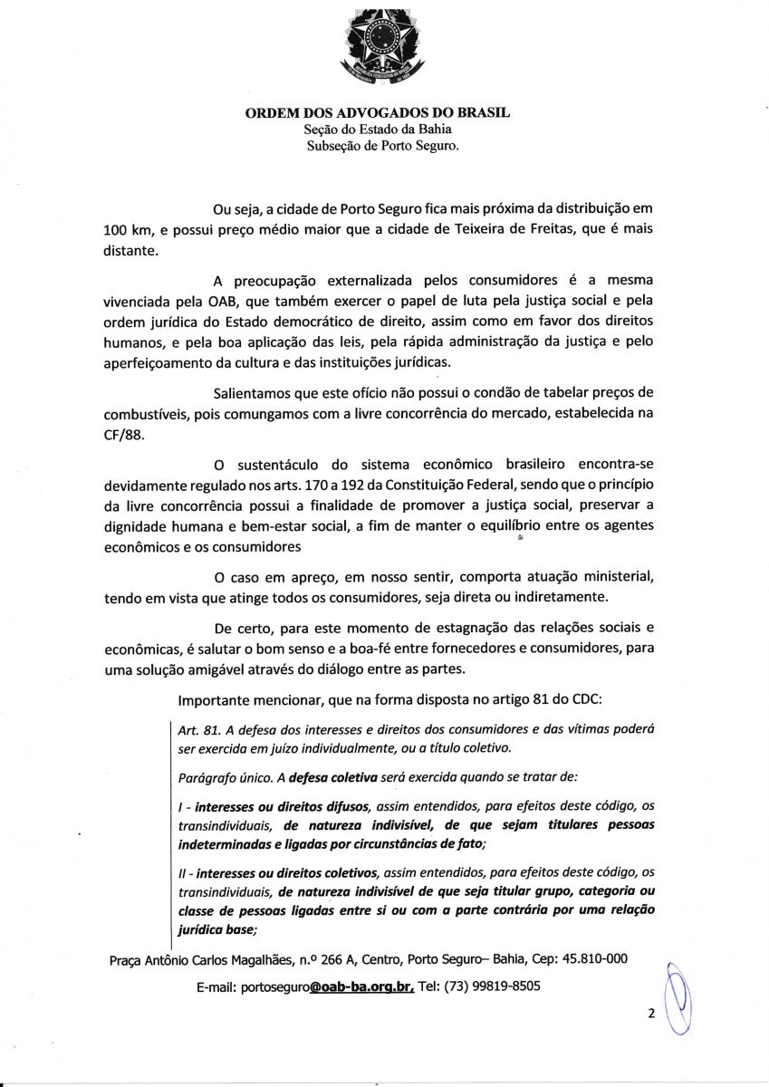 "O ofício foi emktido no mesmo na cidade de Eunápolis, ambos já foram assinados, na TERRA MÃE DO BRASIL, está sendo encaminhado ao Ministério Público através do Drº Vinicius Barcelar, presidente da comissão de Direitos do Consumidor da OAB Porto Seguro”.