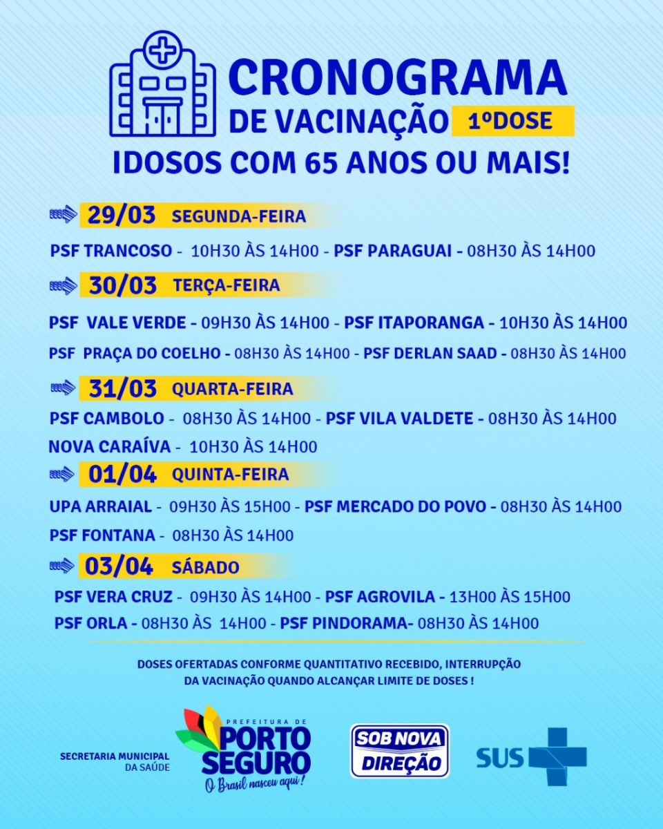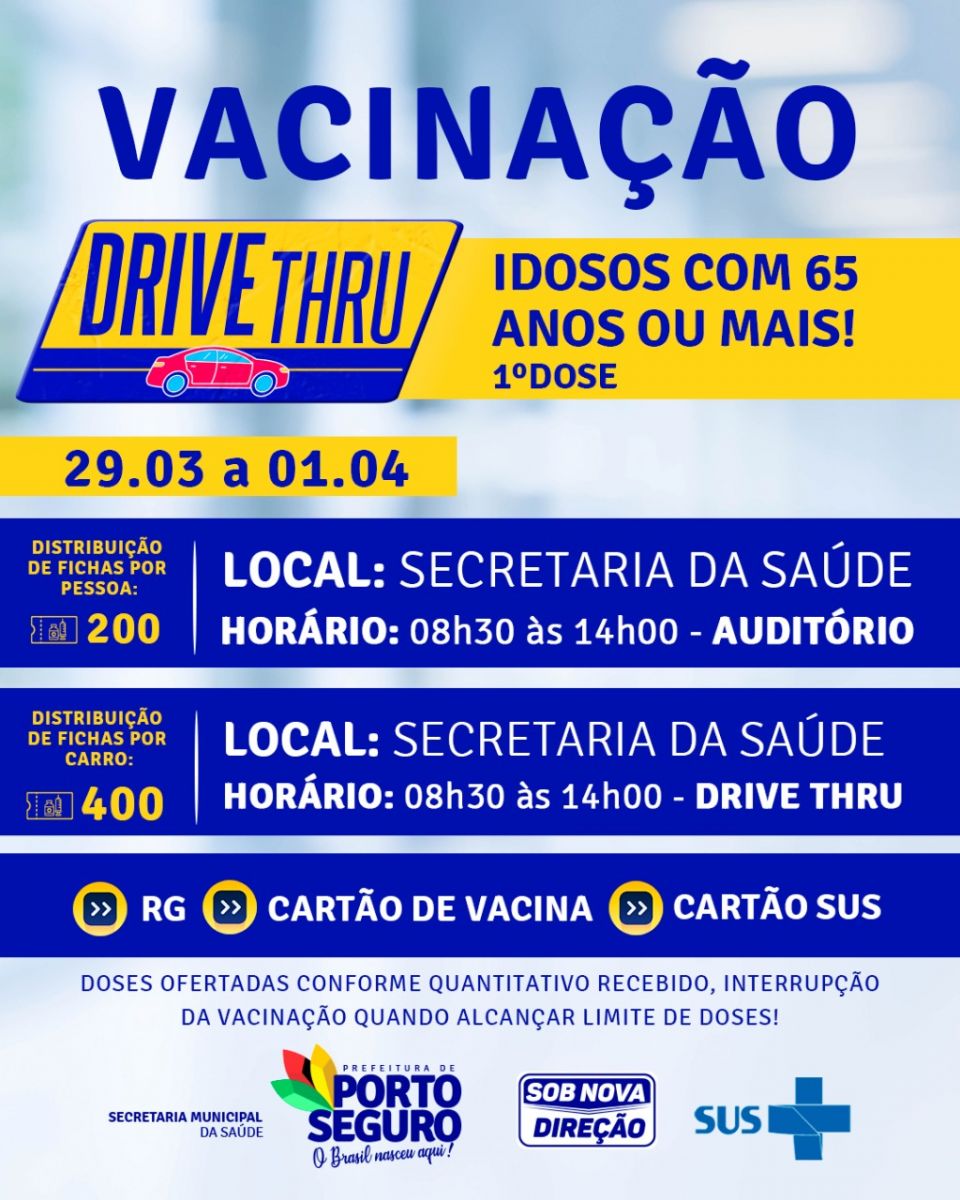 A prefeitura de Porto Seguro segure o cronograma de vacinar maior número de pessoas no menor tempo possível, de acordo com a quantidade de doses existes. Desta forma, a imunização contra a Covid-19, em sistema drive-thru, em frente a sede da Secretaria de Saúde continua de segunda-feira 29 de março, a quinta-feira 1º de abril.