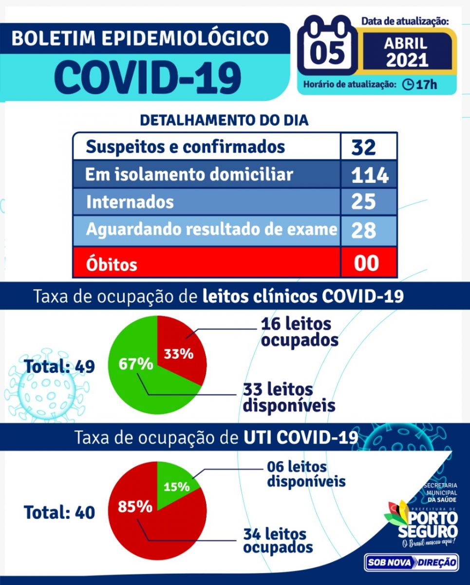 A prefeitura de Porto Seguro, através da Secretaria Municipal de Saúde, informa que no período de 14/03/2020 a 05/04/2021, foram 17.599 casos de COVID-19, sendo 6.919 confirmados e 10.680 suspeitos, classificados de acordo com a sintomatologia clínica.