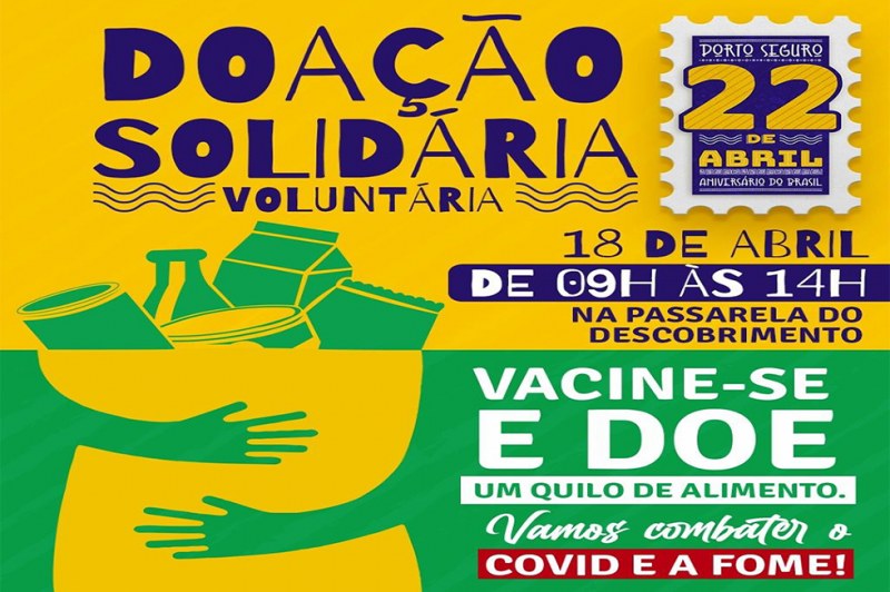 Neste domingo, 18 de abril, durante o mutirão de vacinação realizado na Passarela do Descobrimento para idosos a partir dos 60 anos, a prefeitura de Porto Seguro promove campanha Solidária de Arrecadação de Alimentos para combater a fome por conta da Pandemia da covid-19. A vacinação começa a partir das 09:00 no sistema DRIVE THRU e vais até às 14:00, neste período, quem puder, leve e doe alimentos não perecíveis, os quais serão doados à famílias de baixa renda.