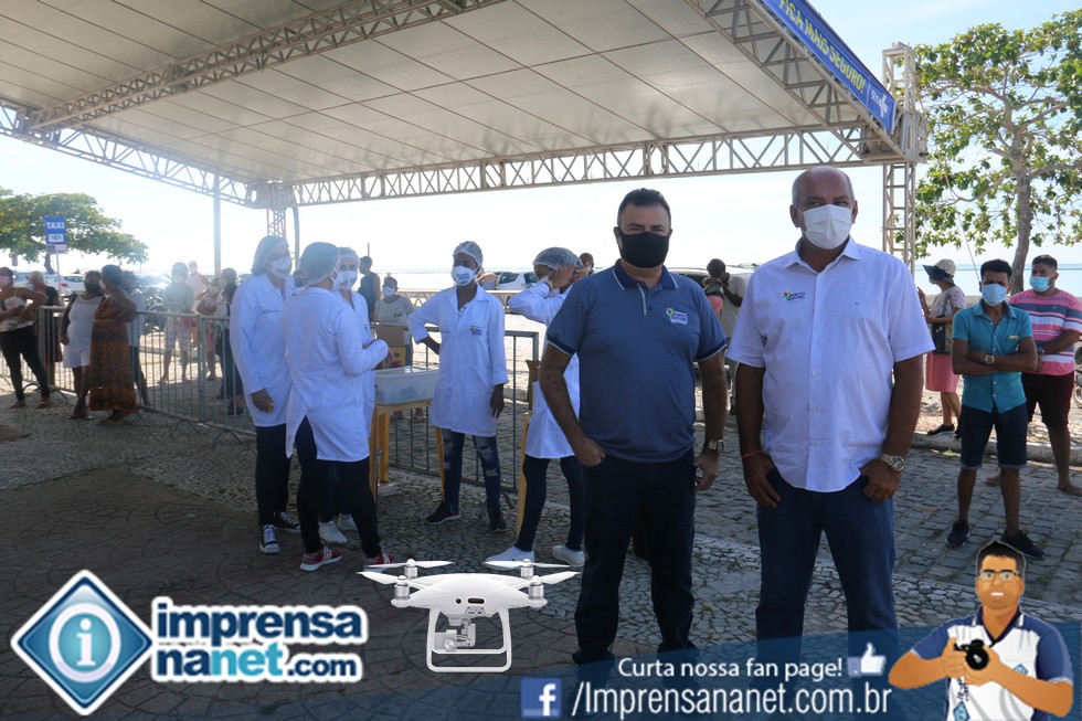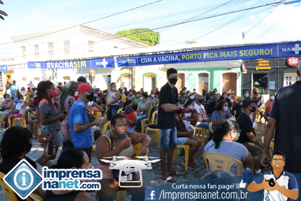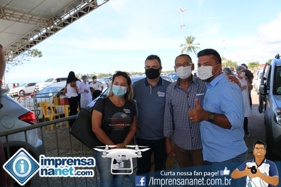 Para atender a meta da vacinação, a prefeitura de Porto Seguro montou duas megas estruturas, uma para atender aos idosos que chagavam ao mutirão em veículos, sendo atendidos via DRIVE THRU. Na segunda estrutura, uma grande tenda com profissionais da saúde e servidores voluntários faziam o atendimento e orientação aos idosos, os quais, eu outra tenda, aguardavam ‘sentados’ protegidos do sol, o momento de receber o imunizante.