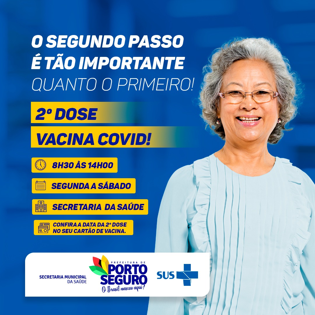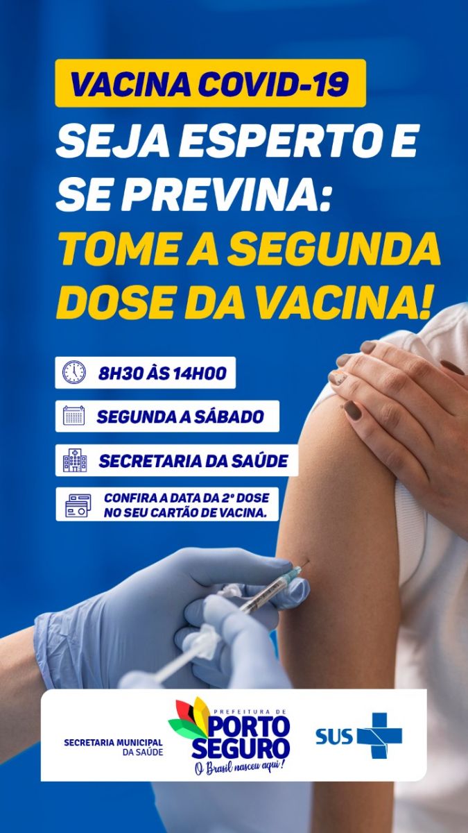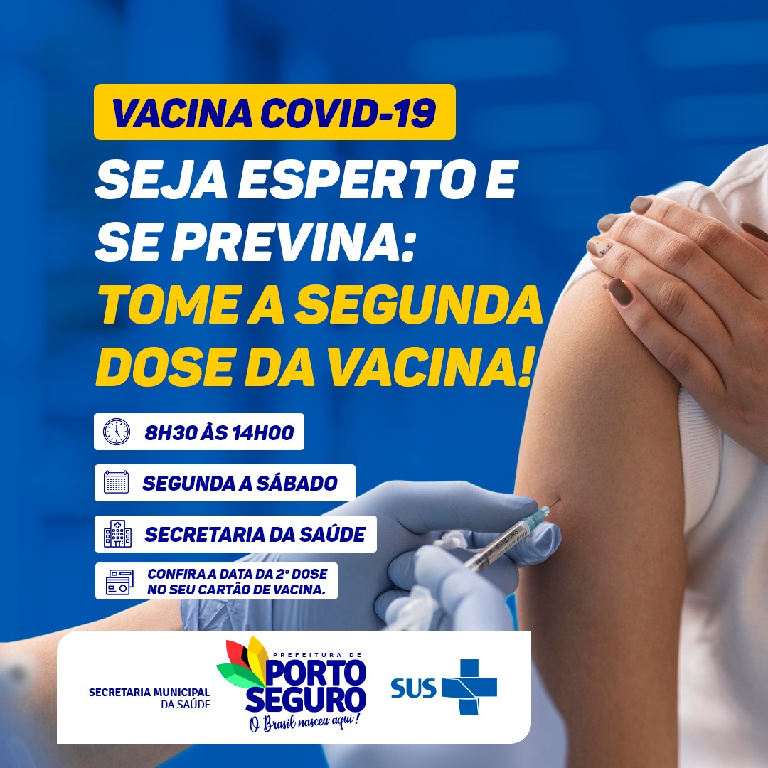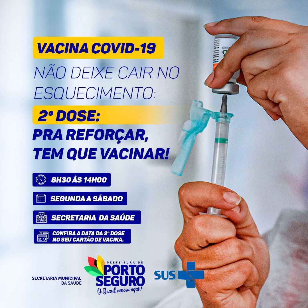 Através da Secretaria Municipal de Saúde, a Prefeitura de Porto Seguro, desde o início da campanha de vacinação contra a COVID-19, preocupada com a população da Terra Mãe do Brasil, vem alertar a importância de completar o ciclo vacinal, a garantia de que a pessoa foi vacinada depende dessa segunda dose.