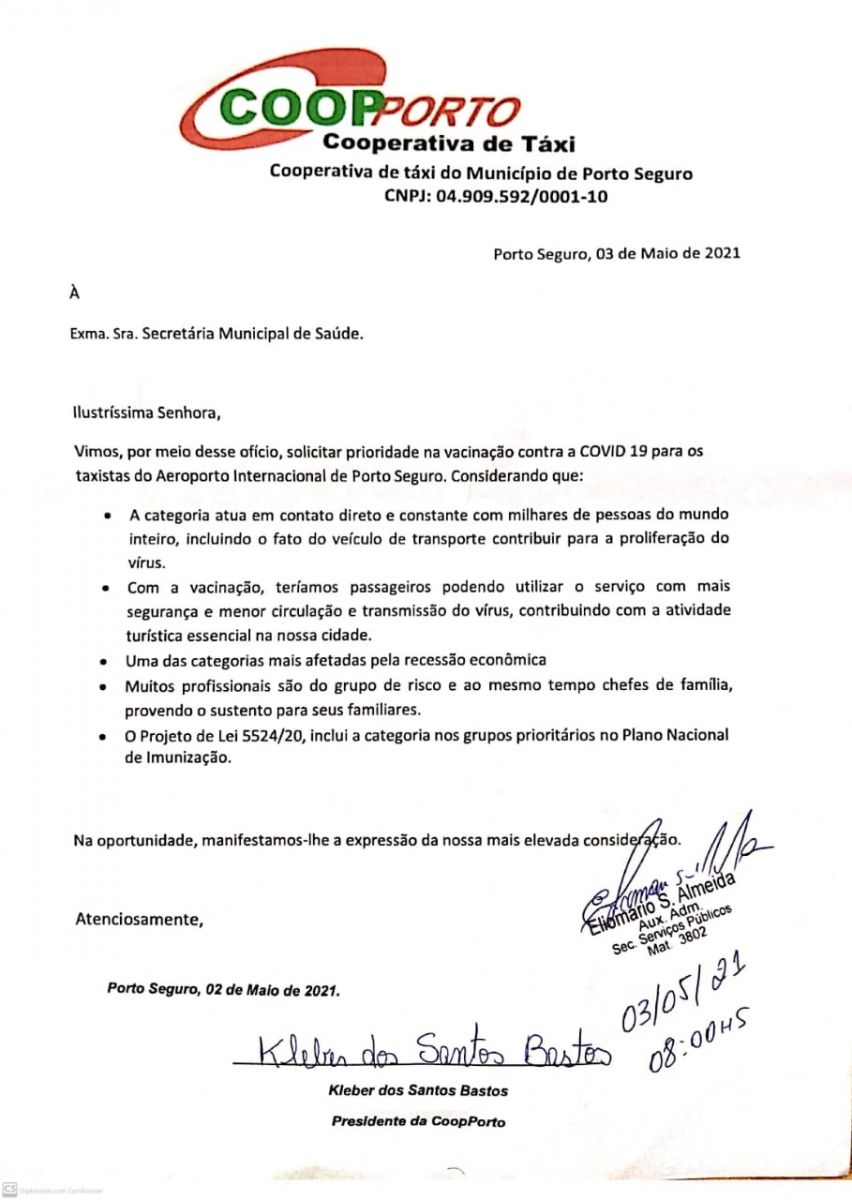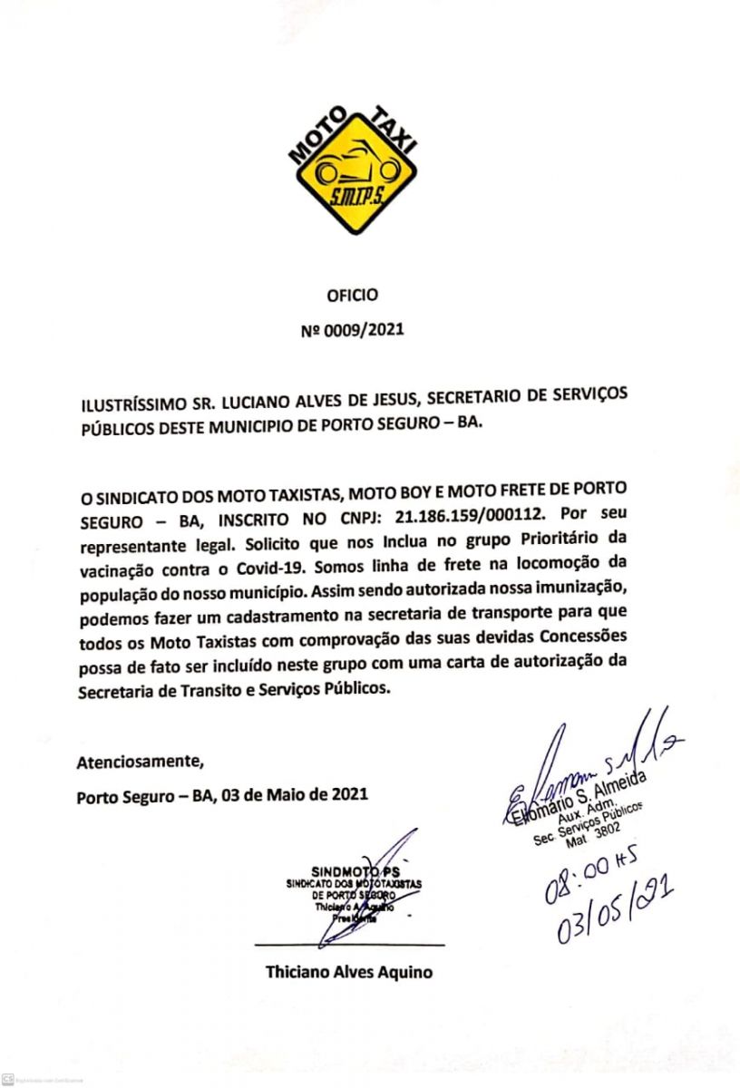 Na manhã desta segunda-feira 03/05, o presidente da Cooperativa de Táxi do Aeroporto, juntamente com o presidente do Sindicato de Mototáxis de Porto Seguro, protocolaram junto à Secretaria de Serviços Públicos, pedido de PRIORIDADE na imunização das respectivas classes contra a Covid-19.