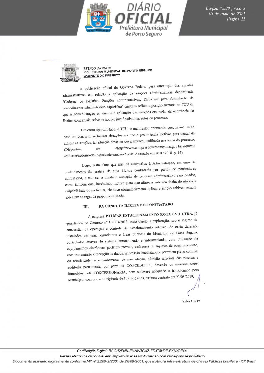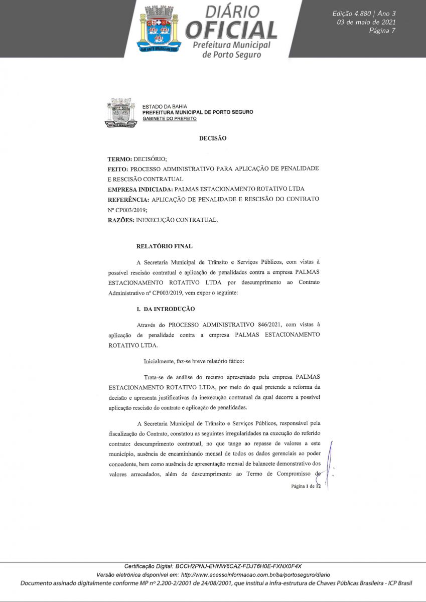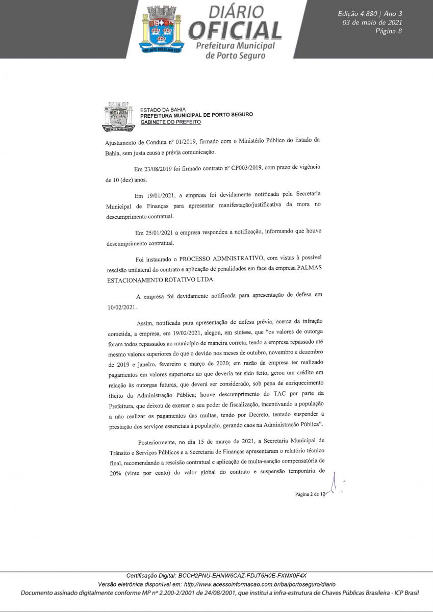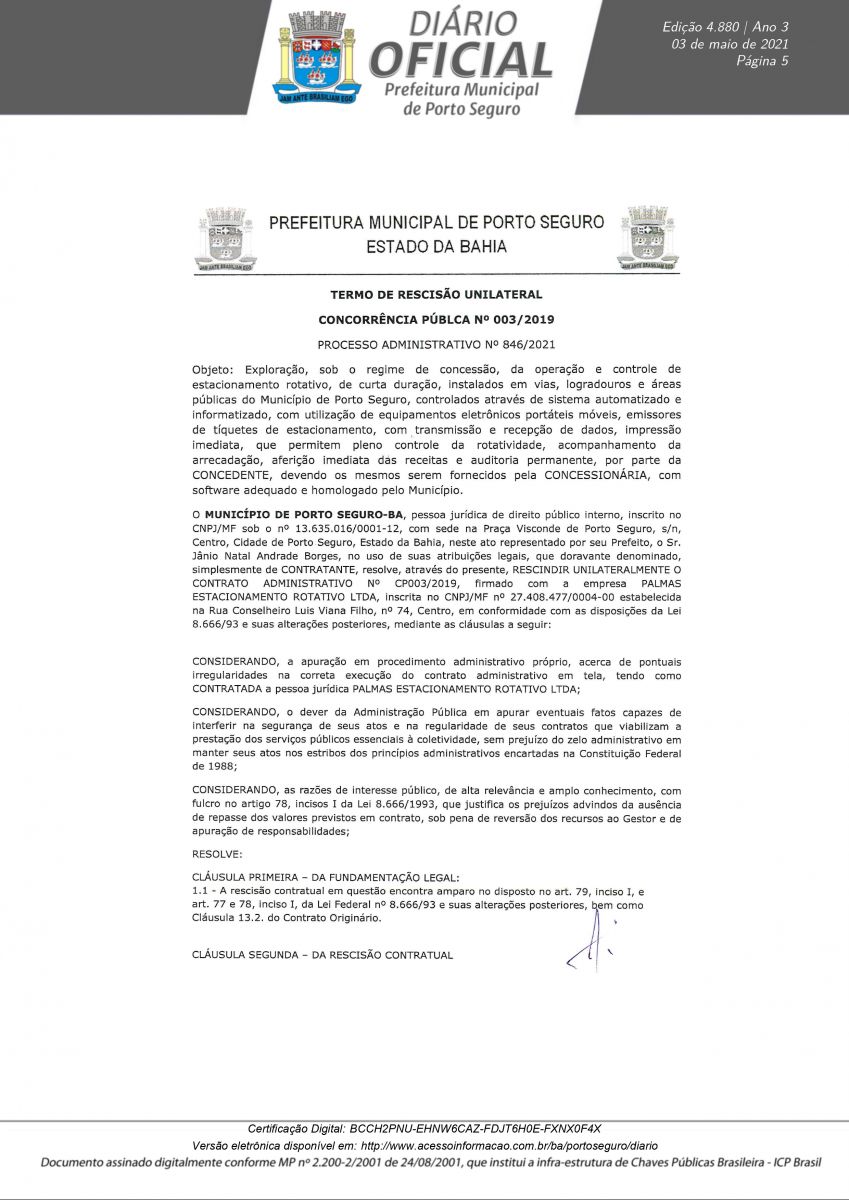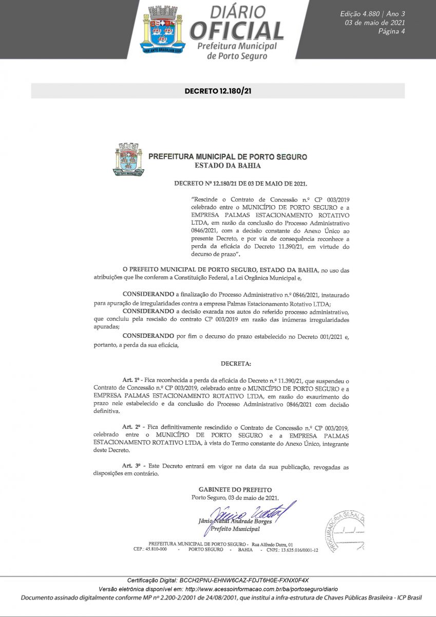 Decreto 12.180/21 assinado pelo prefeito Jânio Natal, nesta segunda-feira 03/05, rescinde definitivamente o Contrato de Concessão CP N° 003/2019 em nome da empresa Palmas Estacionamento Rotativo LTDA. A decisão foi tomada após a conclusão do Processo Administrativo N° 0846/2021, instaurado para apurar irregularidades na concessão, operação e transparência do serviço pra contratado.