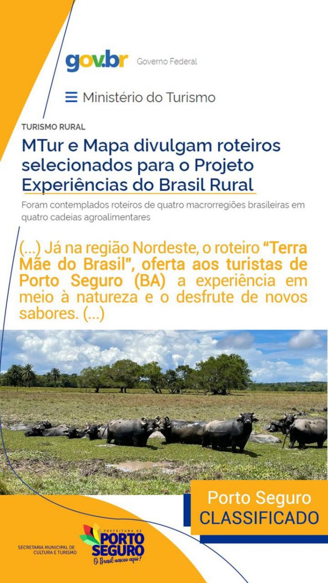 O roteiro turístico “Terra Mãe do Brasil, seus caminhos, segredos e sabores”, de Porto Seguro, no extremo Sul da Bahia, foi classificado pelos Ministérios do Turismo (Mtur) e da Agricultura, Pecuária e Abastecimento (Mapa) para o “Projeto Experiências do Brasil Rural”, segundo a lista publicada nesta sexta-feira (07/05) no portal do Mtur. Na primeira etapa, 52 propostas foram inscritas, sendo apenas 15 classificadas para a segunda e última fase.