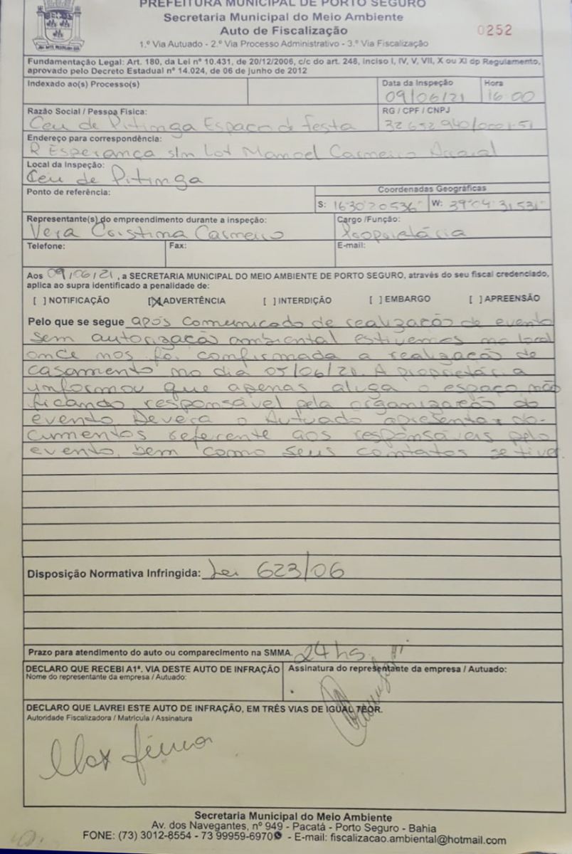 Após a notícia viralizar e chegar ao conhecimento da gestão municipal, agentes da Secretaria Municipal de Meio Ambiente foi ao local averiguar as denúncias e adotar medidas administrativas. Na oportunidade, a proprietária do estabelecimento, a Srª Vera Cristina Carneiro foi notificada, a qual alegou que apenas aluga o espaço, entretanto, como proprietária, Vera é a responsável legal pelo que acontece no local com base na Lei 623/06, ela terá 24hs para apresentar esclarecimentos sobre a realização do evento sem autorização dos órgãos competentes.