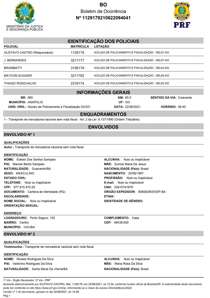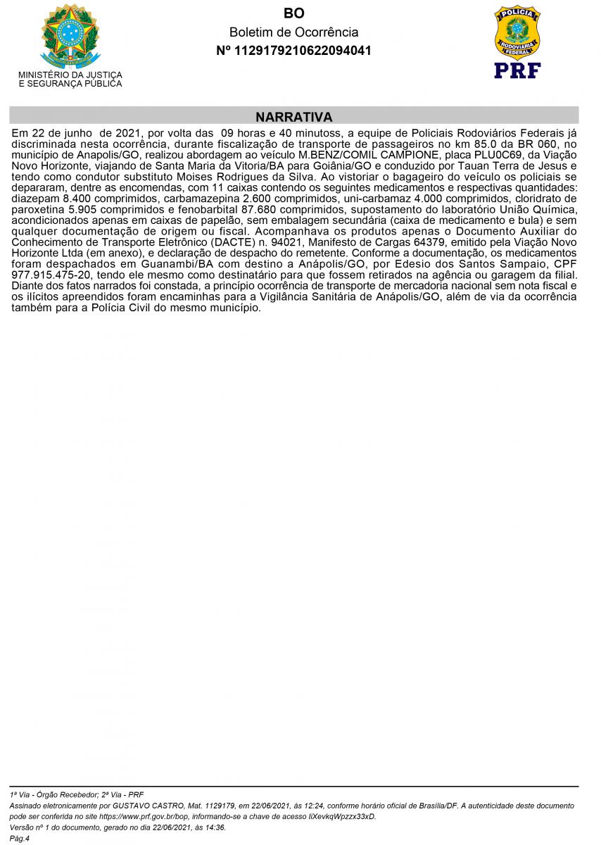 No final da tarde desta quarta-feira 23/06, a reportagem do Imprensananet.com teve acesso ao Boletim de Ocorrência da PRF de Goias, e, ao contrário do que foi erroneamente vinculado em um site local, não há portosegurenses envolvidos. Veja abaixo os nome e cidade de origens e endereço da pessoa presa por envolvimento no caso e de duas testemunhas da operação que apreendeu mais de 100 mil reais em medicamentos.