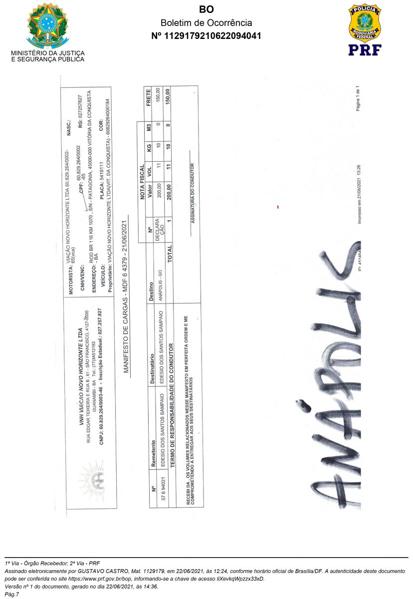Veja abaixo Boletim de Ocorrência da Polícia Rodoviária Fedrral de Goiais