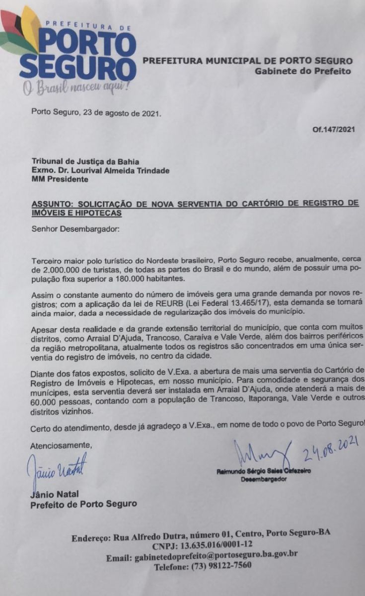Na manhã desta terça-feira 24/08, o prefeito Jânio Natal, através do 'OFÍCIO 147/2021', solicitou ao Tribunal de Justiça da Bahia, na pessoa do seu presidente, o Exmo Drº Lourival Almeida Trindade, pedido para implantação da 'SERVENTIA' do Cartório de Registro de Imóveis e Hipoteca no Distrito do Arraial d´Ajuda, Orla Sul de Porto Seguro. O pedido tem como base a Lei Federal REURB de Nº 13467/17, a qual gerou considerável aumento na demanda de novos registro em Porto Seguro, cidade com população superior a 180 mil habitantes.