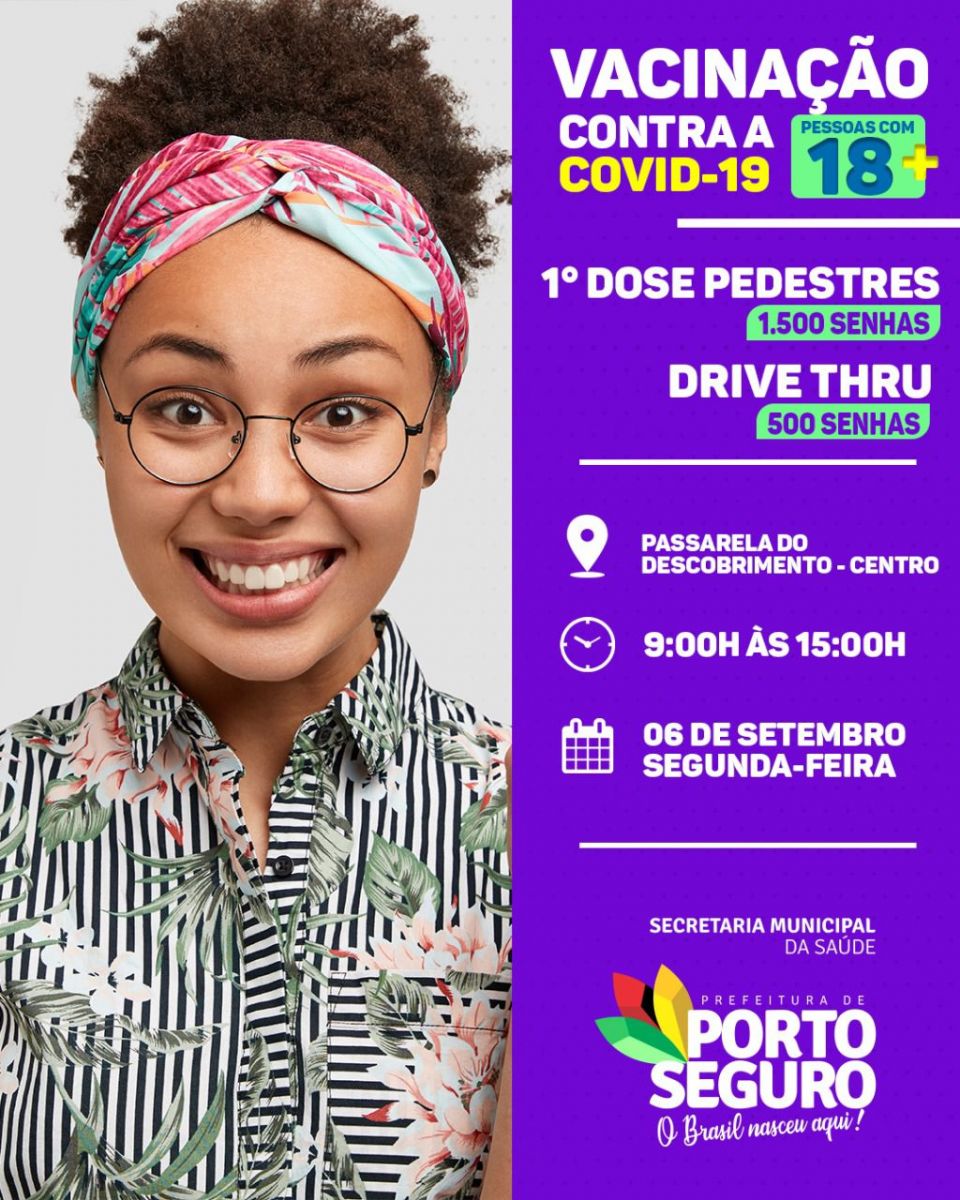 Seguindo o cronograma de vacinação, Porto Seguro começa a vacinar na próxima segunda-feira 06/09, jovens com idades a partir dos 18 anos. A prefeitura de Porto Seguro, através da Secretaria Municipal de Saúde, está promovendo mais uma 'AÇÃO PELA VIDA' com 1.500 doses para pedestre e 500 doses ara o sistema Drive Thru.