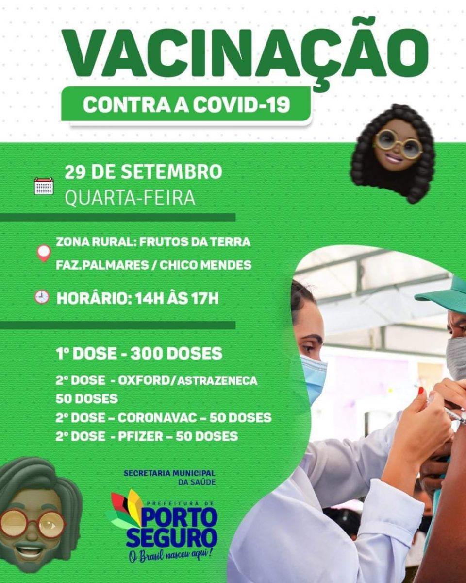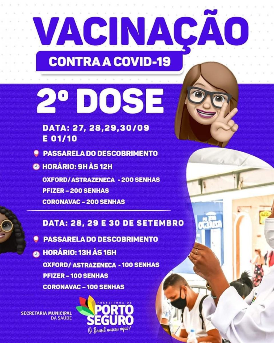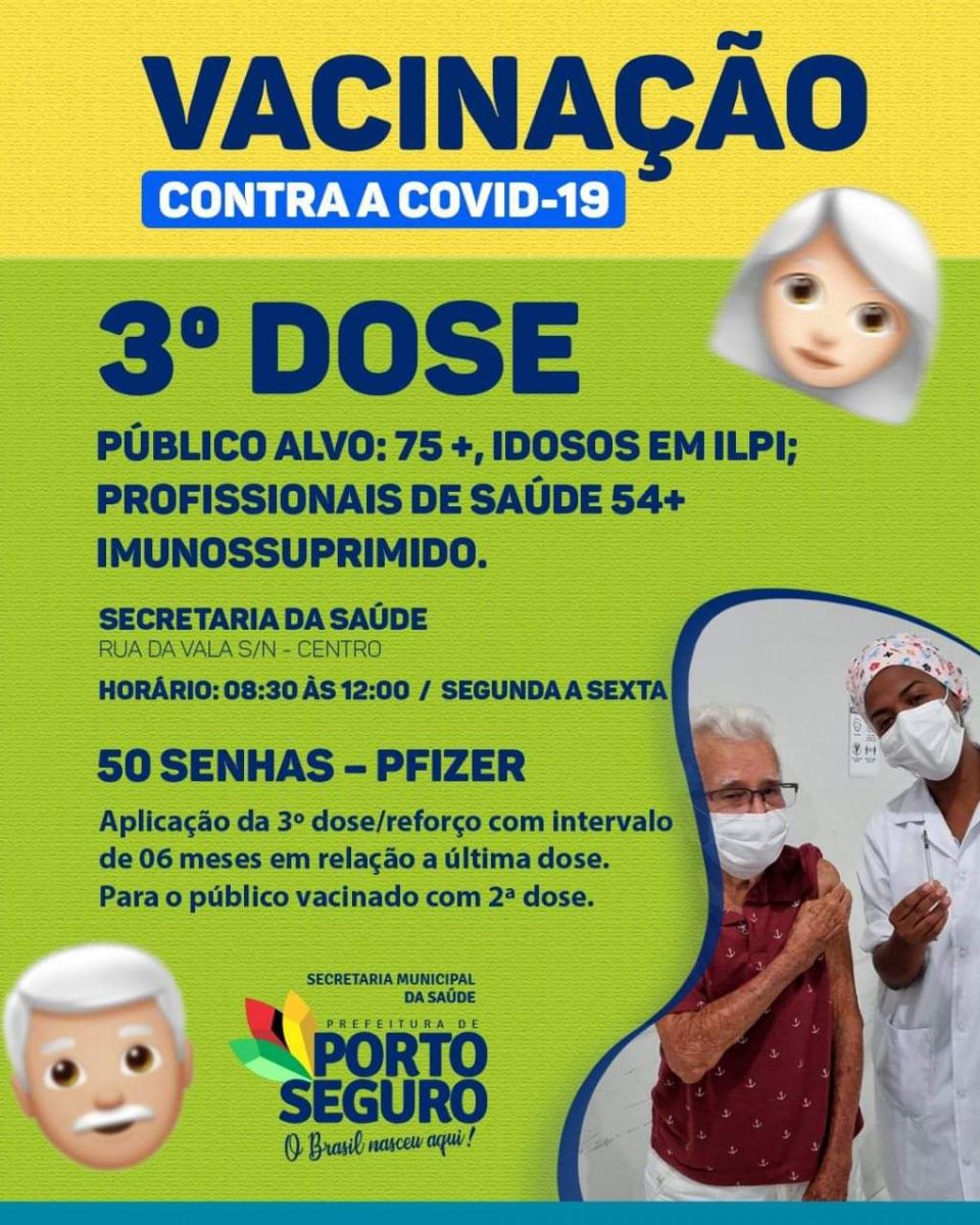 A prefeitura de Porto Seguro, através da Secretaria Municipal de Saúde segue a PRIORIDADE de IMUNIZAÇÃO contra a Covid-19. Veja abaixo o cronograma da imunização de PRIMEIRA, SEGUNDA e TERCEIRA DOSE, além da vacinação para pessoas com COMORBIDADES.