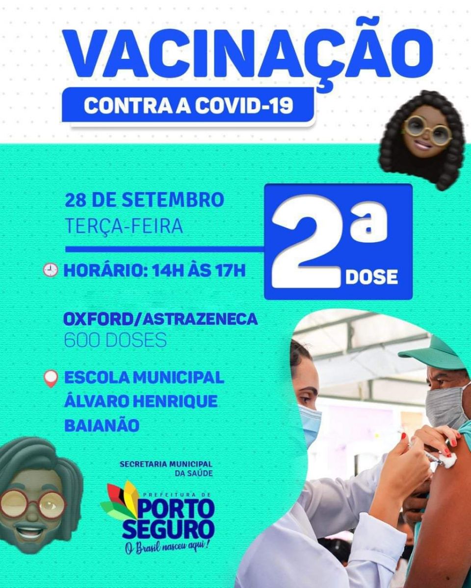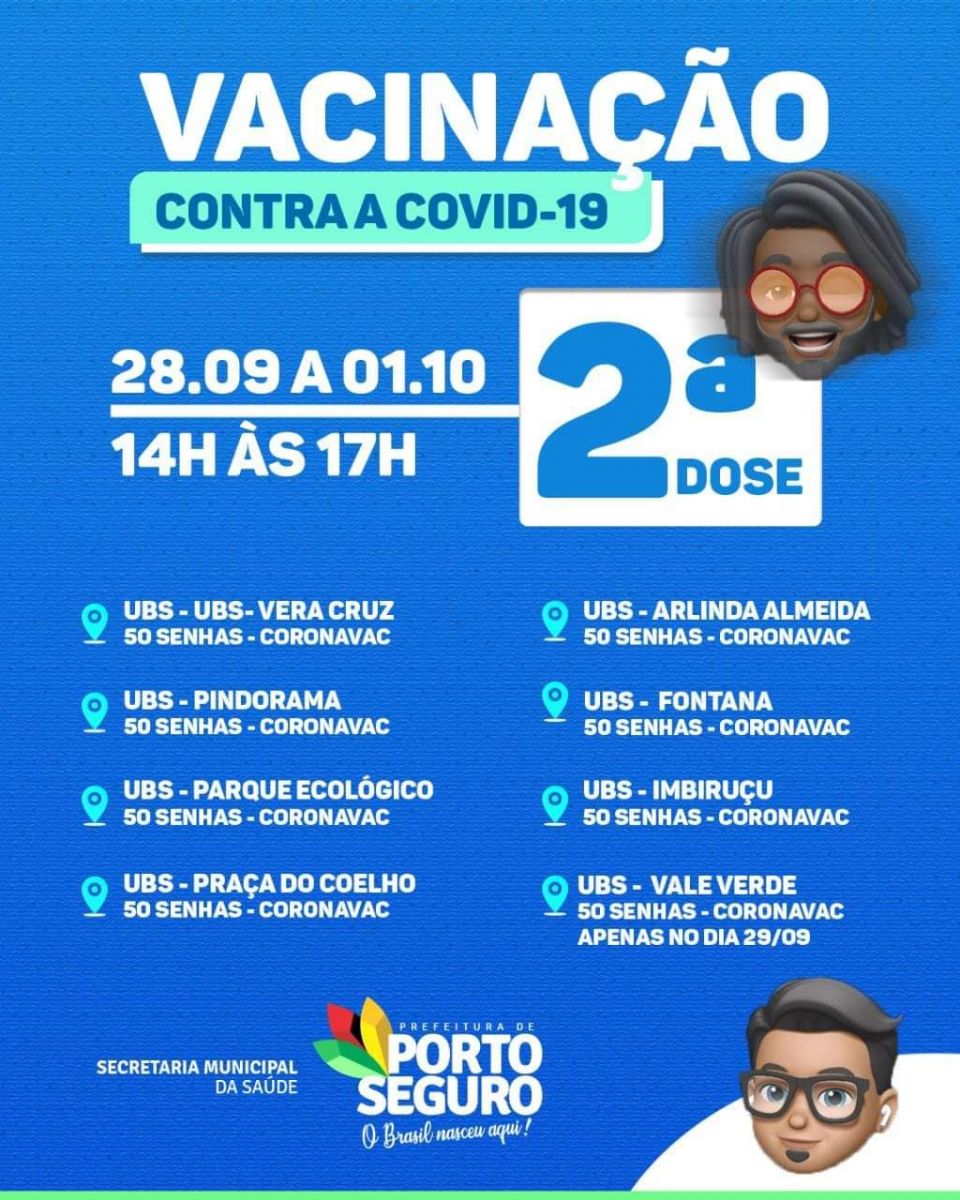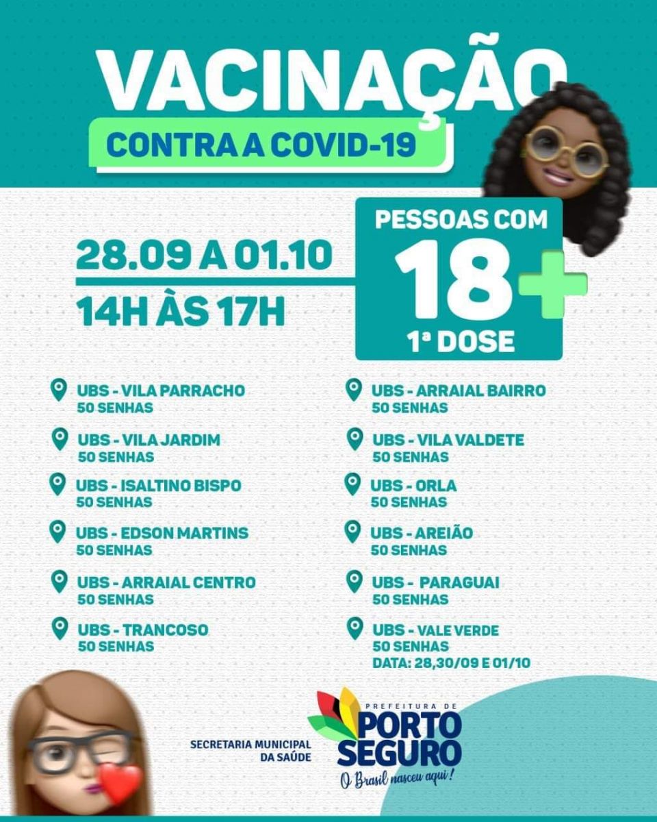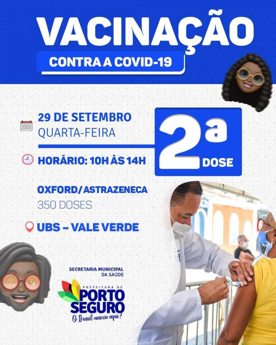 A prefeitura de Porto Seguro, através da Secretaria Municipal de Saúde segue a PRIORIDADE de IMUNIZAÇÃO contra a Covid-19. Veja abaixo o cronograma da imunização de PRIMEIRA, SEGUNDA e TERCEIRA DOSE, além da vacinação para pessoas com COMORBIDADES.