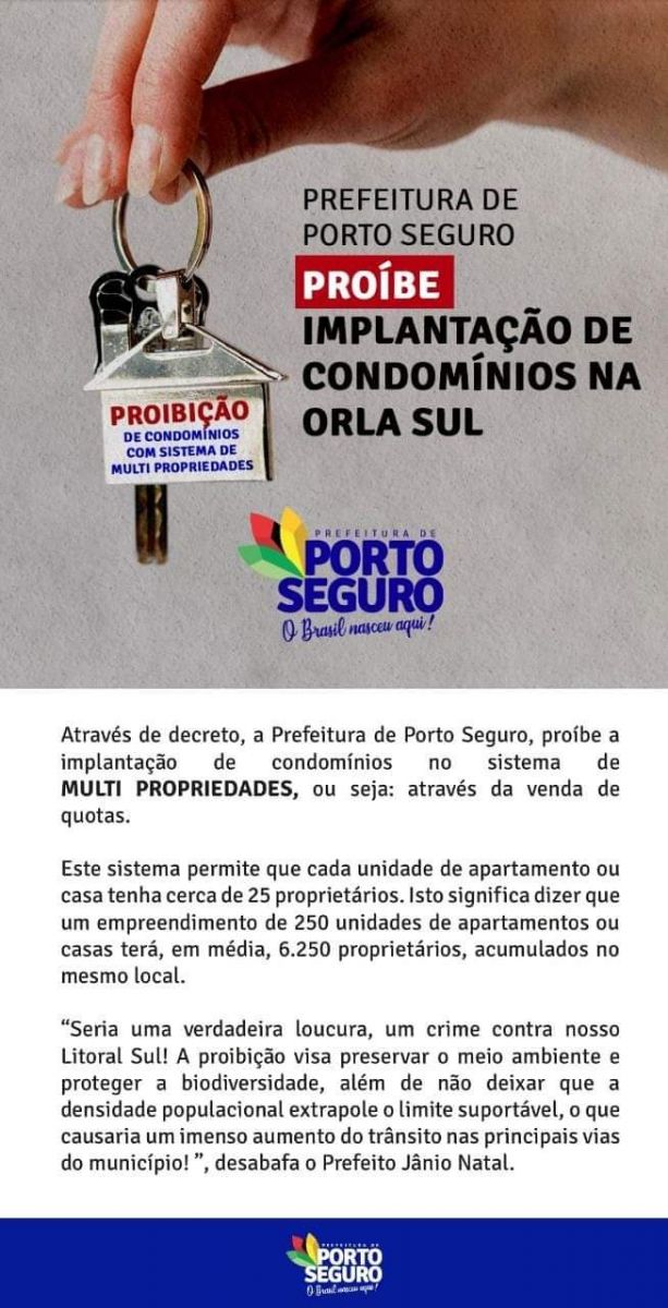O prefeito de Porto Seguro, o Sr° Jânio Natal, proíbe através de DECRETO, a implantação de condomínios no sistema 'MULTI PROPIEDADES' na Orla Sul da Terra Mãe do Brasil. Veja abaixo a decisão;