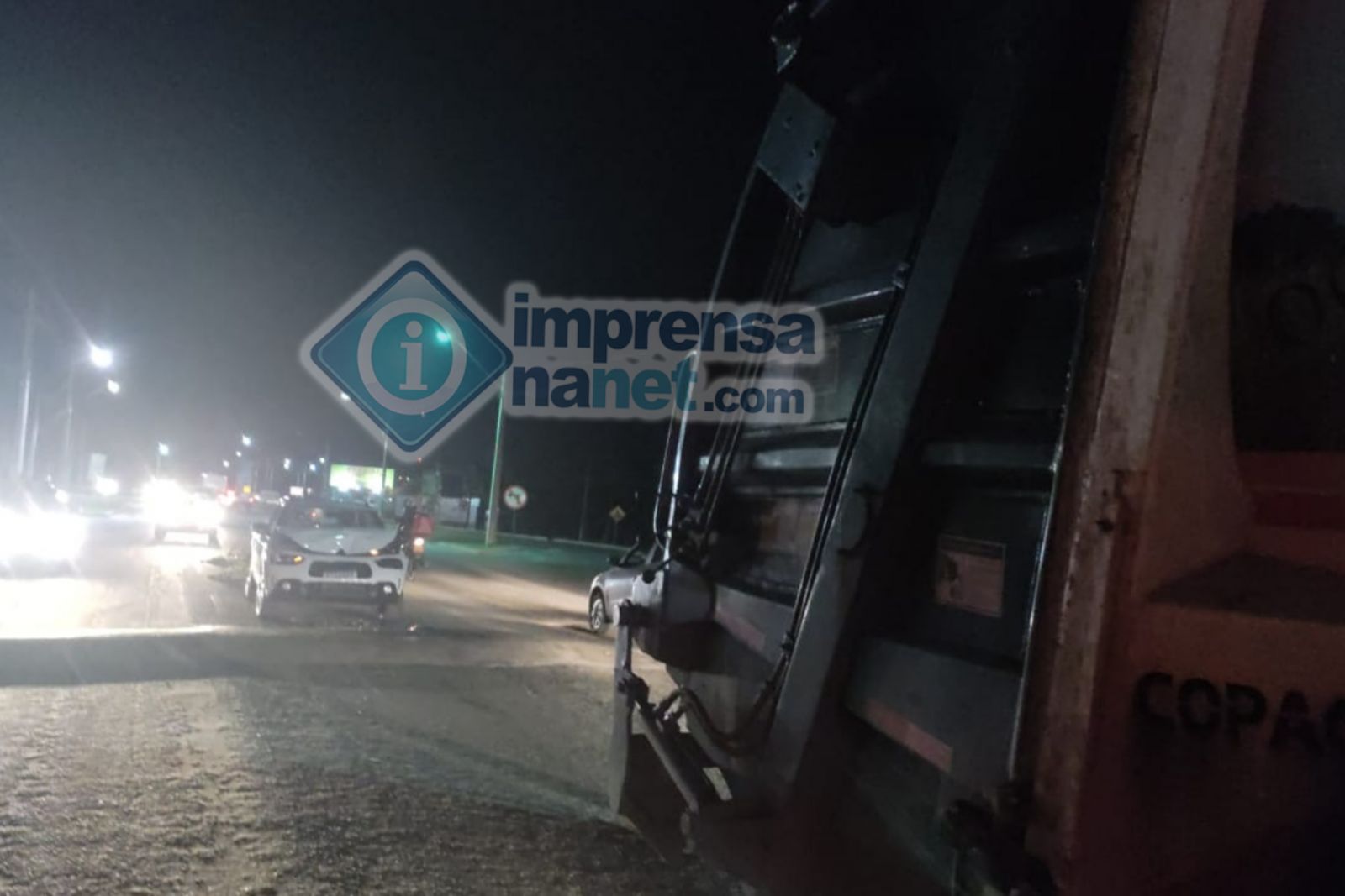 Um acidente automobilístico, na noite desta segunda-feira, 3, na Rodovia BR 367, em frente ao Atacado Mineirão, envolvendo um Citroën C4, placa RIG 0D09, colidiu no fundo do caminhão coletor e atingiu dois operadores que faziam a coleta.
