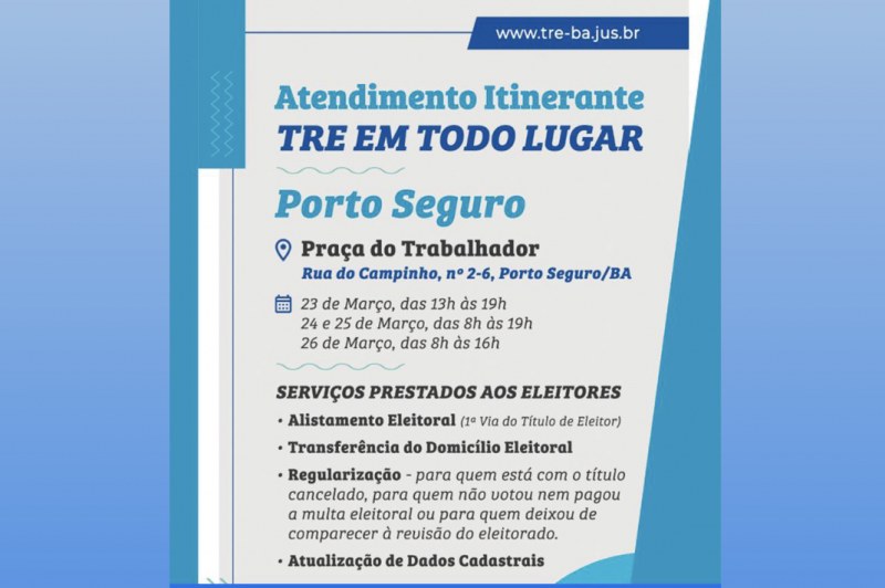 Esta semana, de quinta-feira a sábado (24 a 26/03), o TRE Itinerante estará em Porto Seguro. Nos dias 24 e 25/3 (quinta e sexta-feira), o funcionamento será das 8h às 19h e no sábado (26), último dia da ação na cidade, das 8h às 16h.