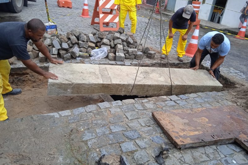Neste final de semana, as equipes da Secretaria Municipal de Infraestutura e Obras realizaram a recuperação do calçamento e do sistema de drenagem da Rua Governador Luís Viana Filho, nas proximidades da balsa.
