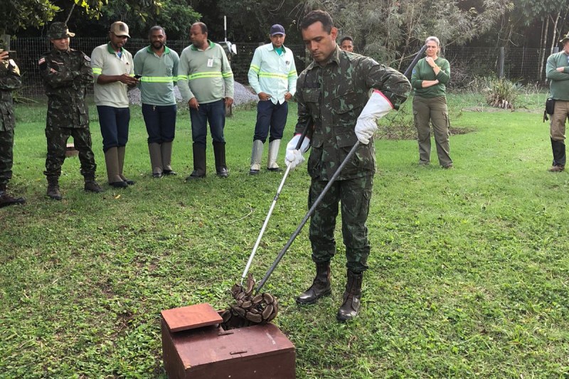 Policiais militares da CIPPA/Porto Seguro, componentes do Corpo de Bombeiros, seguranças da GPS e IBAMA participaram nesta quinta-feira (26/05) de um curso de educação e capacitação para manejo, captura e soltura de animais silvestres. A instrução foi ministrada pelo Sr. Cid, biólogo do Centro de Triagens de Animais Silvestres (CETAS).