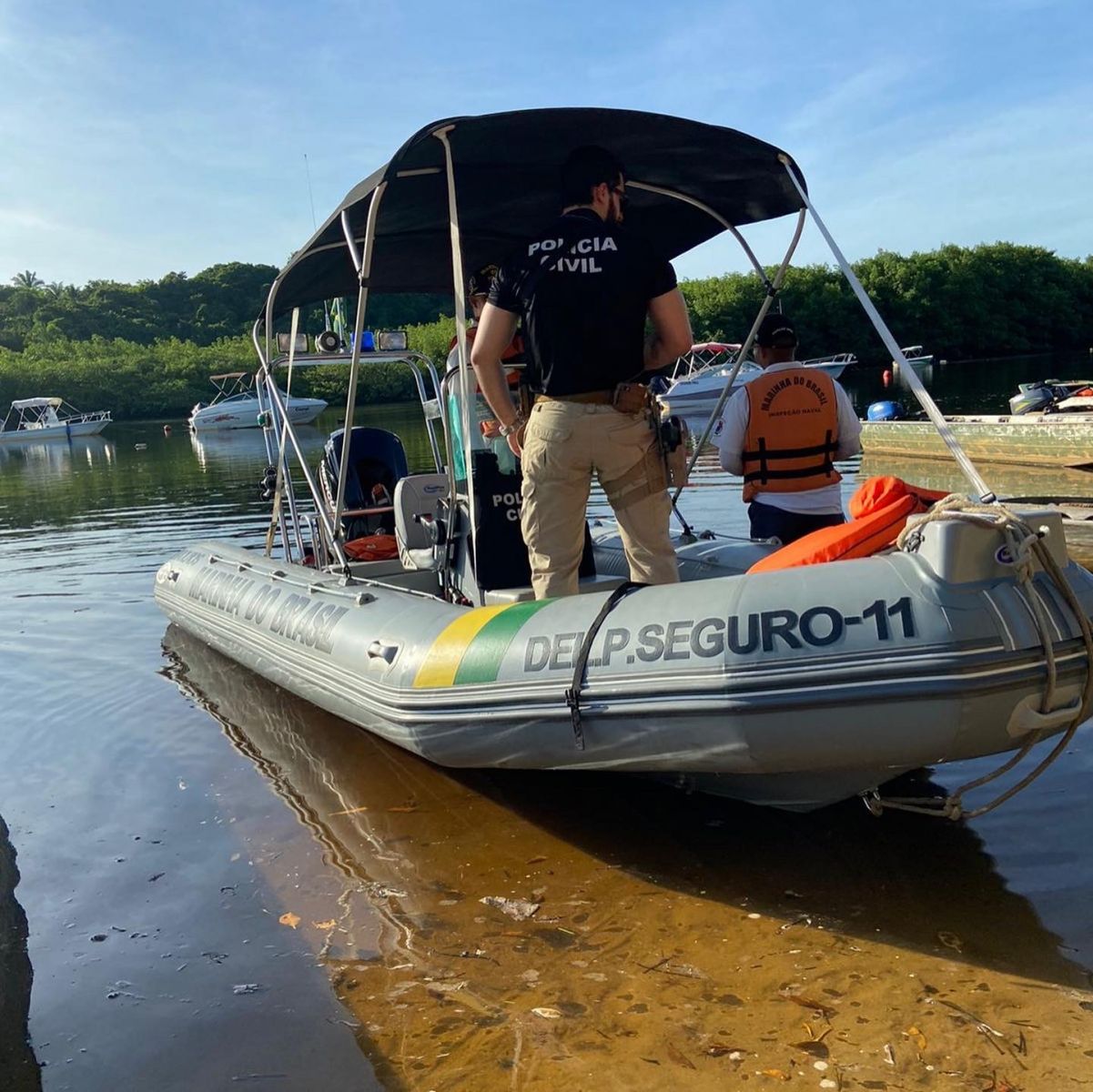 Investigadores da 1ª Delegacia Territorial e da Delegacia do Turista em Porto Seguro participaram de uma ação realizada pela Marinha do Brasil, através da Delegacia da Capitania dos Portos, objetivando treinamento prático em conjunto de incursão e monitoramento.