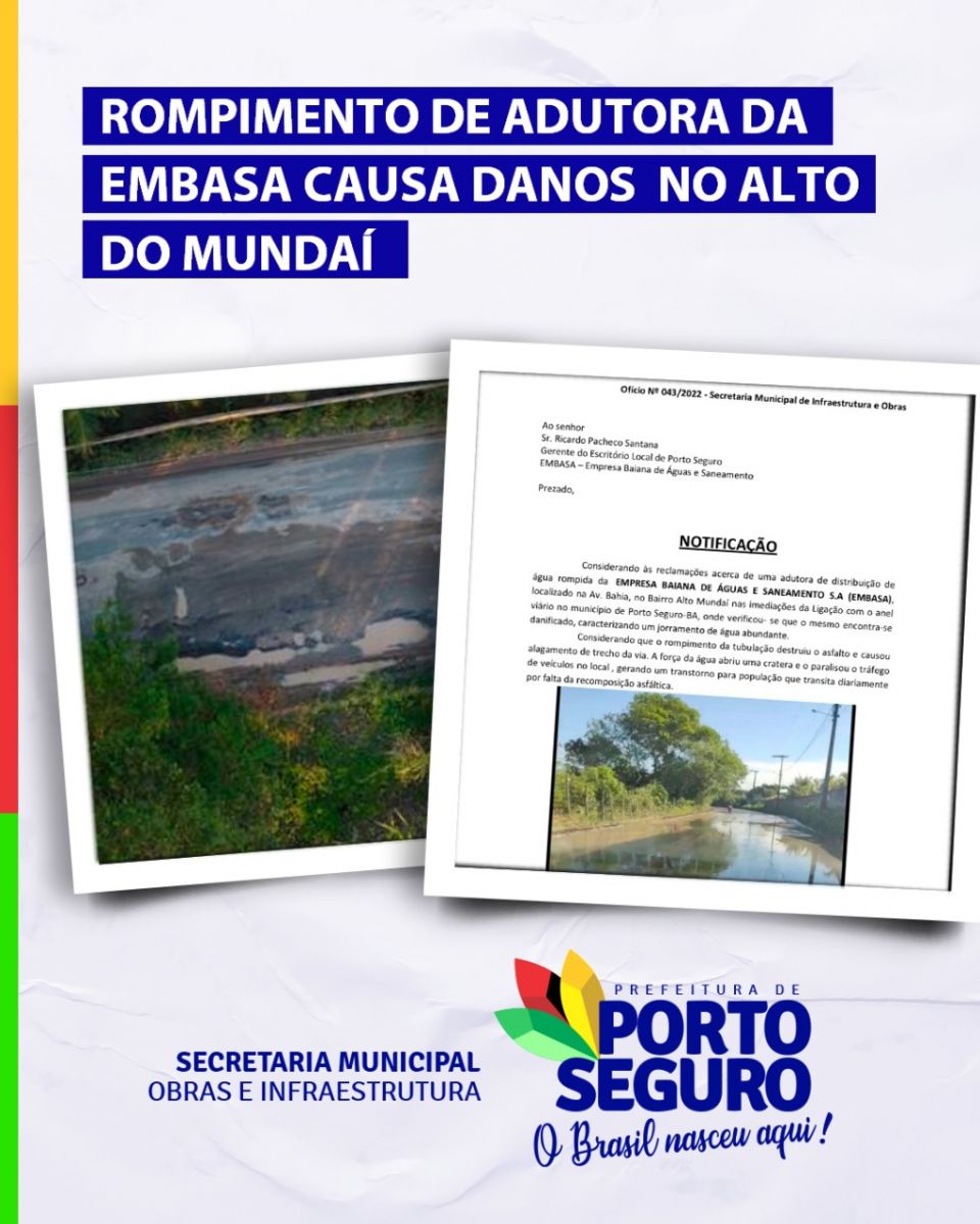 Devido ao rompimento de uma adutora da Embasa, um trecho da Avenida Bahia, no Alto do Mundaí, ficou completamente inundado. A força da água abriu uma cratera, paralisando o tráfego no local e danificando a pavimentação asfáltica, recentemente feita pela Prefeitura.