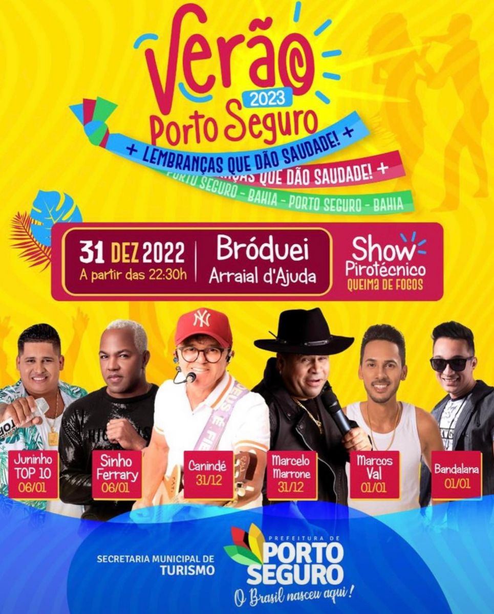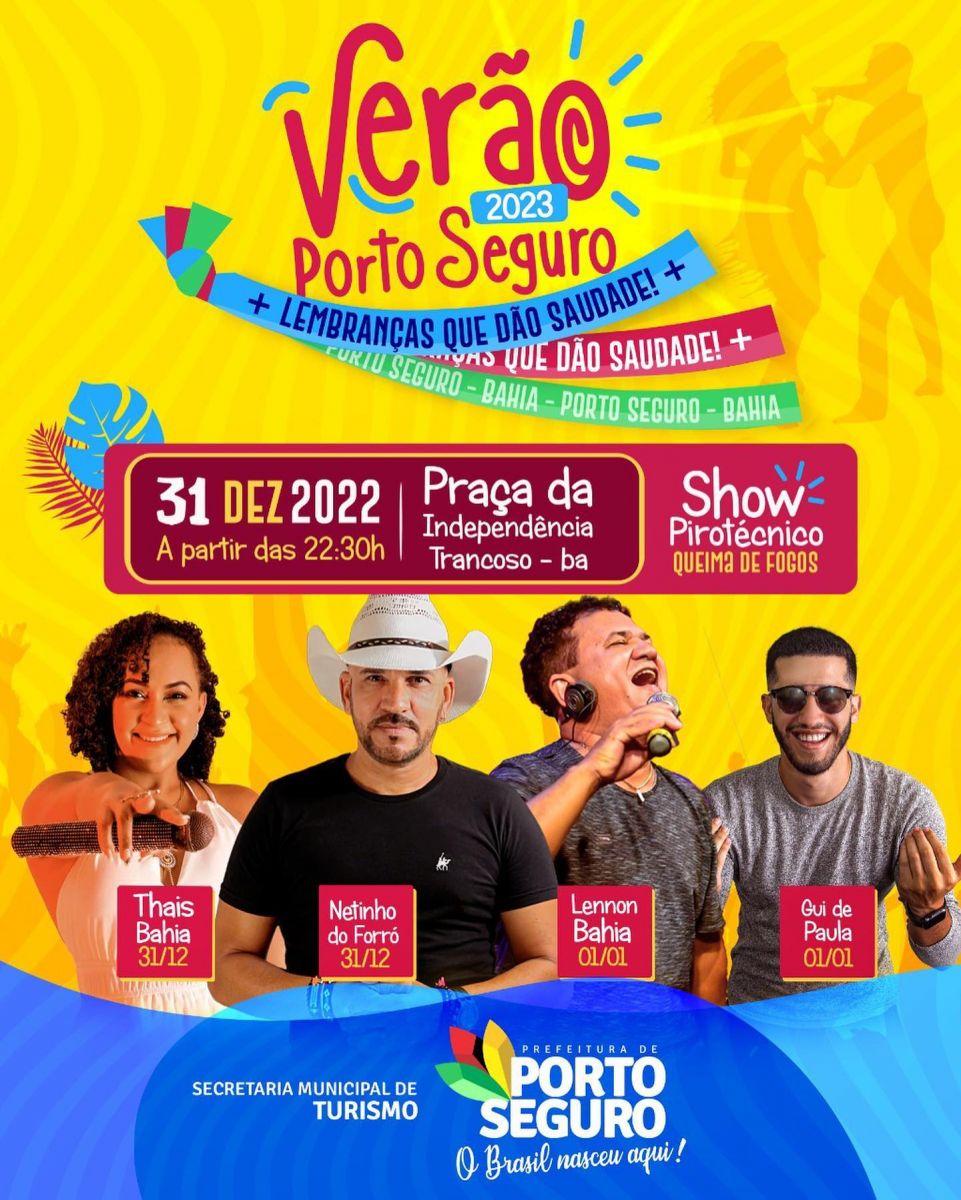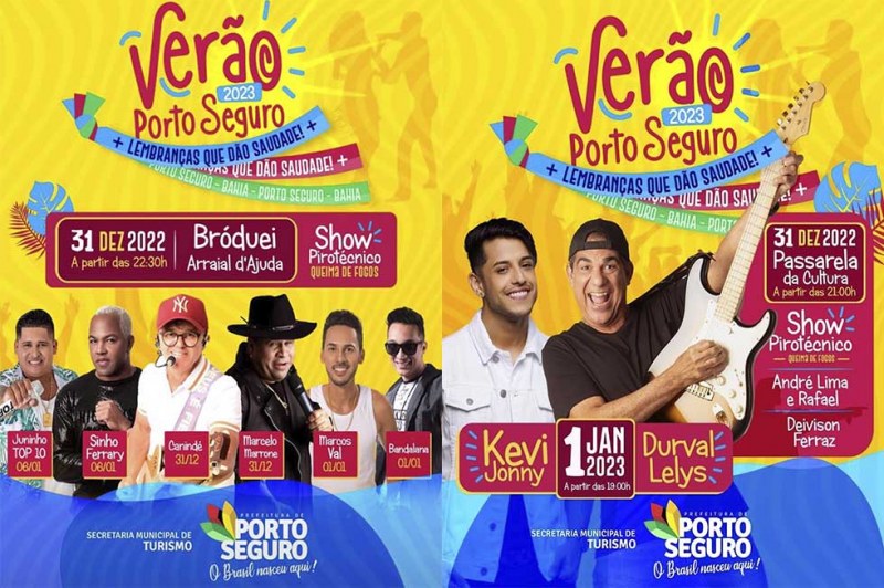 A prefeitura de Porto Seguro está preparando uma grande festa para comemorar a chegada do NOVO ANO. Na Passarela da Cultura, moradores e turístas vão celebrar a chegada de 2023 com um grande SHOW PIROTÉCNICO e show musical com Deivison Ferraz e André Lima e Rafael.