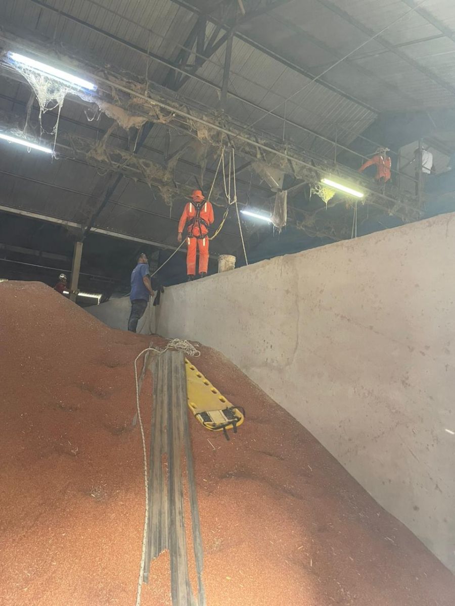Para o resgate do corpo da vítima, a guarnição retirou toneladas de farelo do local. De acordo com os trabalhadores locais, o rapaz estava fazendo a manutenção do depósito que armazenava em torno de 400 toneladas de farelo, quando aconteceu o acidente.