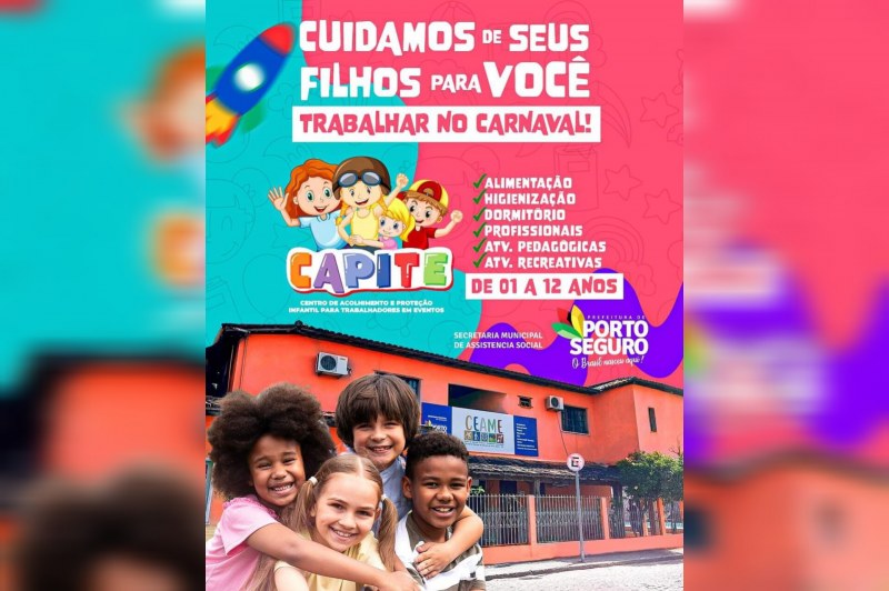 A prefeitura de Porto Seguro vai acolher os filhos de que vai trabalhar como ambulante ou barraqueiro no circuito do Carnaval e não tem com quem deixar os pequenos. Para isso, a gestào municipal preparou um serviço de creche, denominado Capite (Centro de Acolhimento e Proteção Infantil Para Trabalhadores de Eventos), para cuidar das crianças enquanto os pais trabalham.