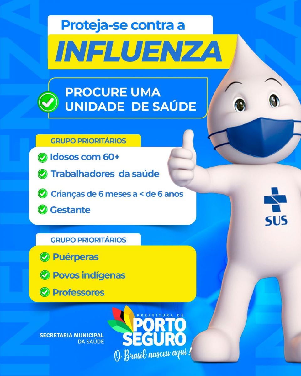 A prefeitura de Porto Seguro, através da Secretaria Municipal de Saúde, iniciou "Campanha' contra a 'Gripe Influenza. A vacinação é uma das medidas de prevenção para proteger contra a doença, suas complicações e óbitos, além de contribuir para a redução da circulação do vírus na população.