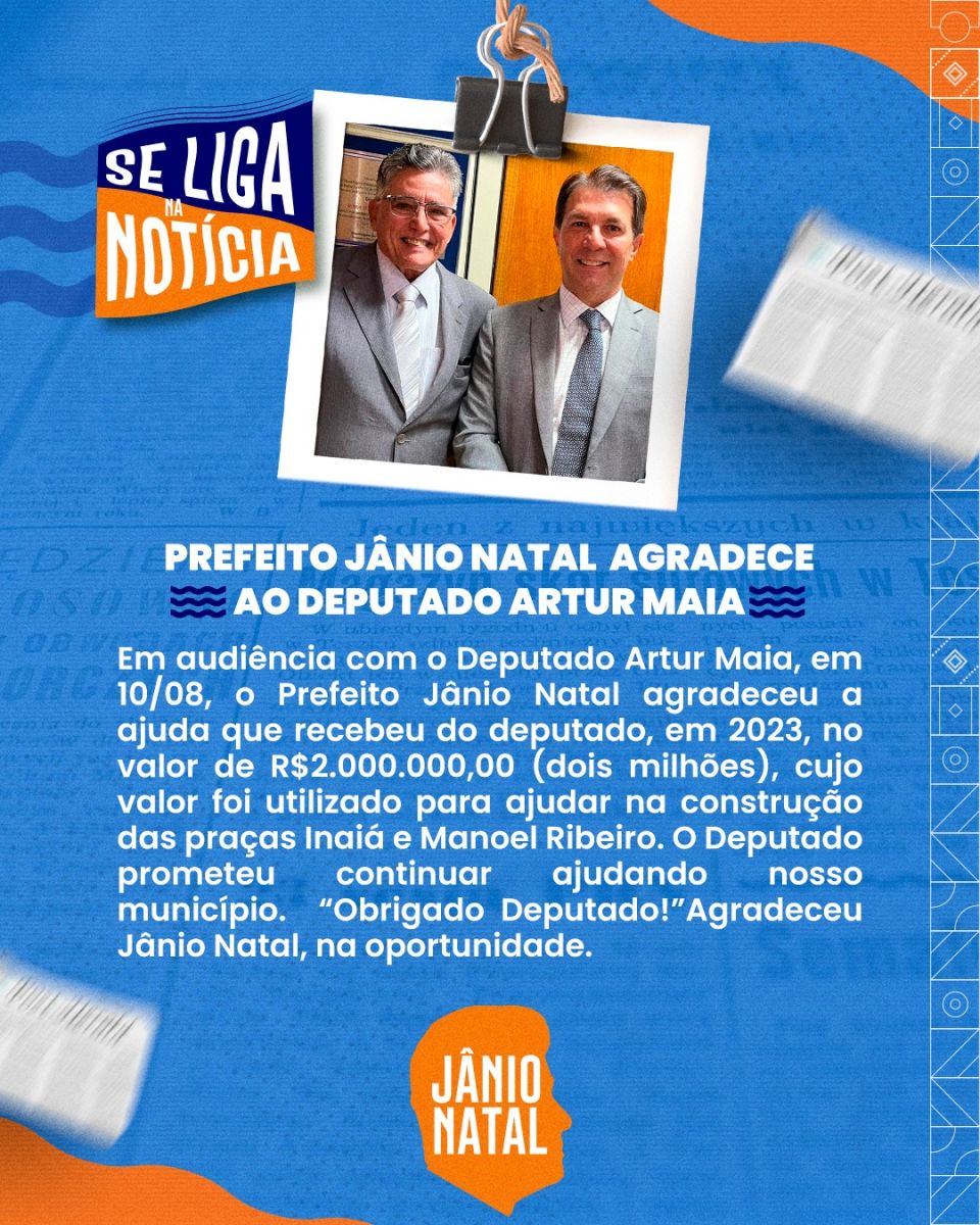 Em nota, o prefeito Jânio Natal agradece publicamente ao deputado Artur Maia, o qual prometeu continuar ajudando a Terra Mãe do Brasil.