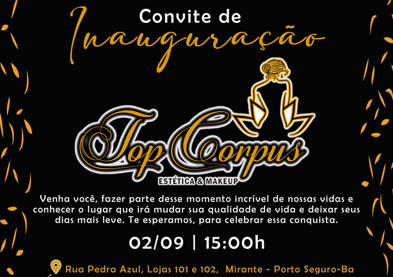 Trazendo cuidado e crescimento de auto estima para a mulherada, a 'Top Corpus' chega na Terra Mãe do Brasil com a sua inauguração neste sábado, 02/09 a partir das 15:00h. O novo empreendimento estará localizado na rua pedra azul, lojas 101 e 102, no Bairro Mirante de Porto Seguro-BA.
