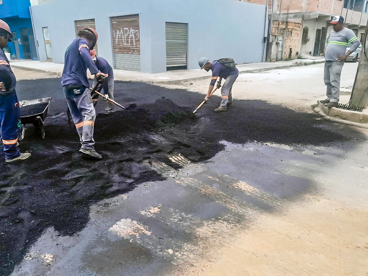Nas localidades com irregularidades no asfalto, as equipes estão recortando o piso e colocando nova camada asfáltica, melhorando as condições das vias.