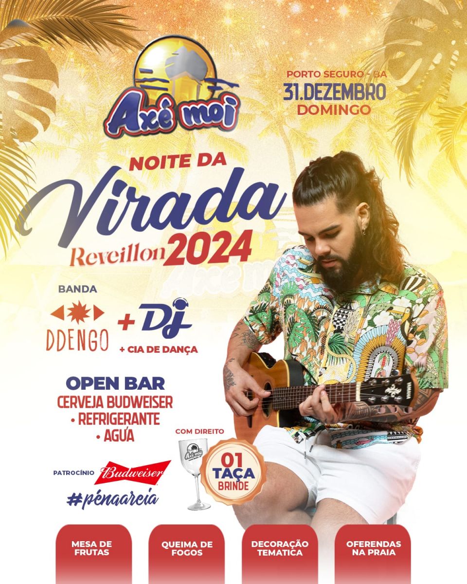 A animação da noite ficará por conta da Banda DDengo, DJ e a nossa Cia de Dança Axé Moi! Celebre a vida. Saúde 2024 no melhor lugar: Cabana Axé Moi! Dia 31/12/2023, a partir das 22h. Maiores informações através das redes sociais oficiais do Grupo Axé Moi, e-mail contato@axemoi.com.br.
