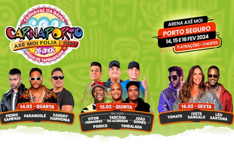 Prepare-se para uma explosão de alegria e música, com uma programação que vai fazer seu coração bater mais forte! Confira as atrações que vão incendiar a Arena Axé Moi: Ivete Sangalo, Tomate, Léo Santana, Parangolé, Xanddy Harmonia, Timbalada, Pedro Sampaio, Psirico e o Trio Pizro com João Gomes, Tarcísio do Acordeon e Vitor Fernandes!