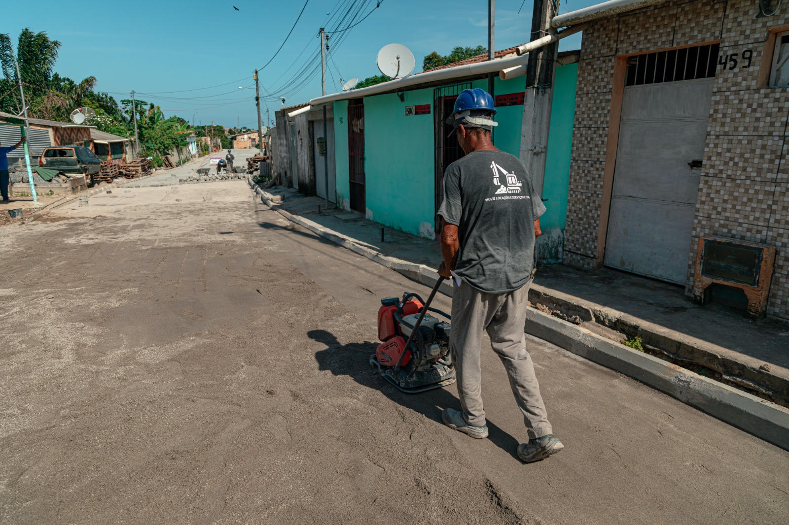 As equipes da Secretaria Municipal de Infraestrutura e Obras já estão na etapa de compactação do solo e colocação dos blocos, em uma obra que representa um grande avanço para a comunidade, onde vivem centenas de famílias e muitas crianças.